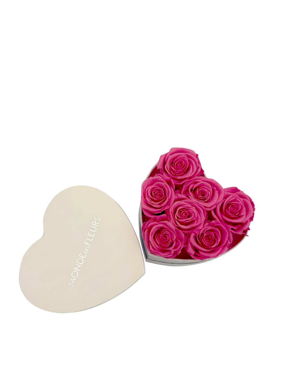 Luxuriöse Verpackung – Herzförmige Box in weiß mit edlem MONDE DES FLEURS Branding.