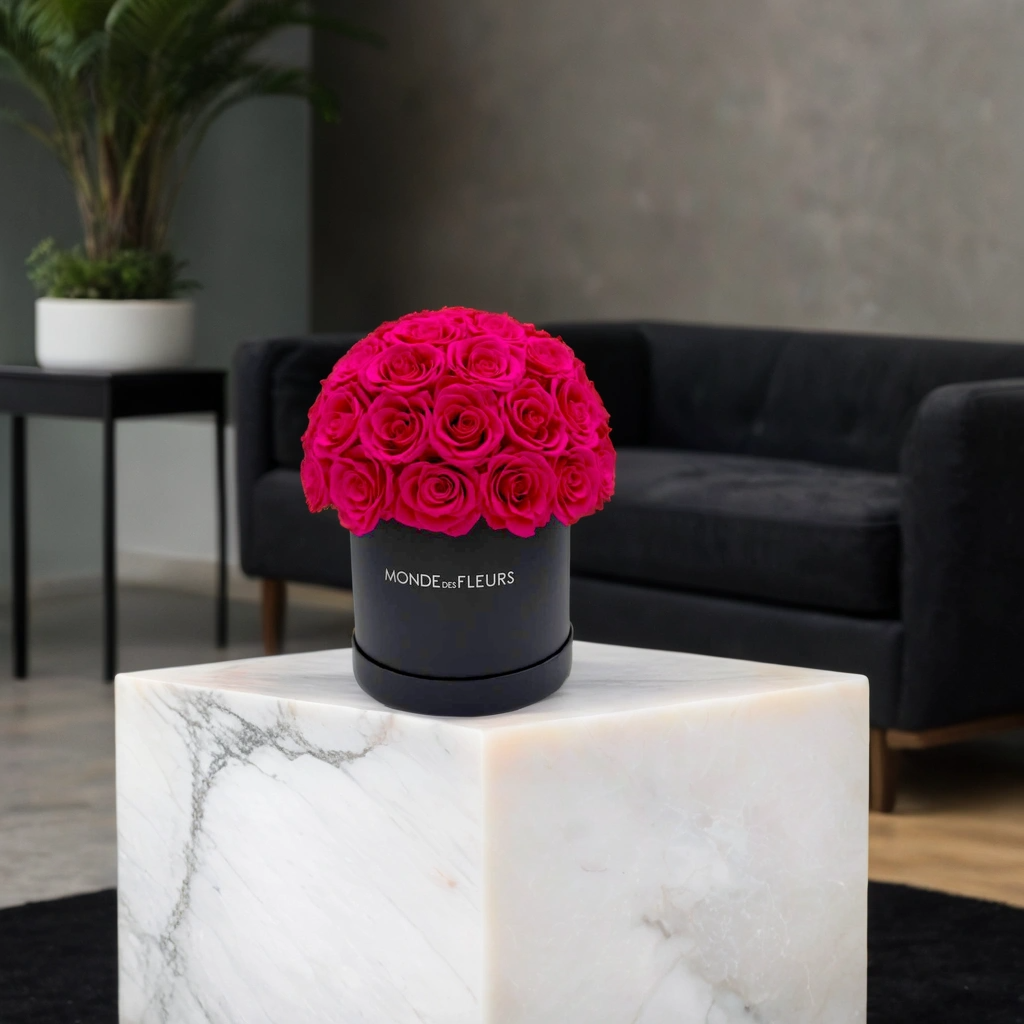 Das Mushroom Shaped Big Pink ist ein außergewöhnliches Rosenarrangement, das durch seine auffällige, pilzförmige Gestaltung sofort ins Auge fällt. In einer eleganten, schwarzen Premium-Box präsentiert, erblühen zahlreiche, intensiv pinkfarbene Rosen zu einer luxuriösen Blumenkrone. Dieses Design steht für Extravaganz und Eleganz zugleich – perfekt, um besondere Anlässe unvergesslich zu machen.